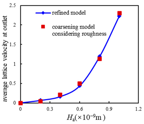 The outlet lattice velocity at the average wall height of the surface under different Ha values.