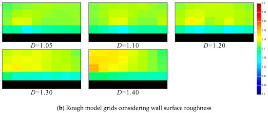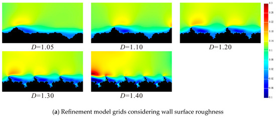 By comparing the simulation results of fractal dimension variation under different wall boundary conditions, it can be seen that the distribution and variation law of transverse velocity field obtained by the two boundary conditions have good consistency. The variation of gas particle flow velocity under different wall surface fractal dimensions is shown in Figure 12: The larger the fractal dimension, the more complex the wall contour, the more frequent the variation of the cross-sectional area of the gas seepage channel, and the greater the disturbance to the flow velocity. In the process of the increase in fractal dimensions, vortex backflow gradually appears near the wall surface, and the overall gas particle velocity decreases to a certain extent. However, as the fractal dimension continues to increase, the vortex radius gradually decreases, and the disturbance effect on the gas particle flow velocity near the wall surface gradually weakens. As shown in Figure 13, when the fractal dimension is 1.40, the area of local gas reverse flow area (the dark blue part) generated by vortex reflux is basically the same as that when D = 1.05. From the perspective of velocity field distribution, the disturbance degree of the wall surface fractal dimension on the gas flow velocity field has a peak value, but the larger the fractal dimension is, the larger the gas flow will be.