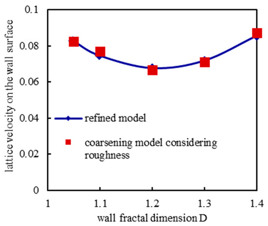The lattice velocity at the average wall height of rock surface under different fractal dimensions.