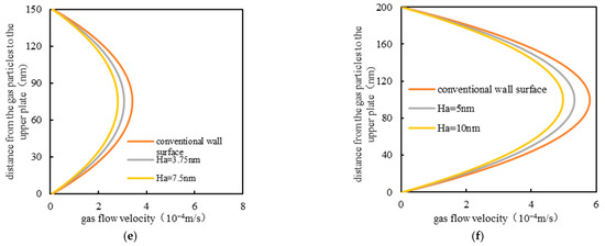As shown in Figure 10, Figure 11 and Figure 12, as Ha increases, the gas particle velocity at the position of the average wall surface height decreases, and the decreasing velocity gradually accelerates. The convex pore wall obstructs the gas flow, thus reducing the slip velocity on the gas wall. In addition, the wall velocity at the outlet end of the model decreases, while the decreasing velocity is gradually slowed. To same extent, the convex wall surface reduces the cross-sectional seepage area of the microchannel, and it also reduces the seepage capacity of gas particle. The coefficient of velocity variation reflects the degree of velocity difference at the average height position of the concave and convex wall surface. The simulation results show that the coefficient of variation for velocity increases rapidly with the increase in Ha. Likewise, the larger the wall undulation, the higher the degree of disorder of the wall through which the gas flows, and the larger the error when the wall is considered a conventional boundary condition.