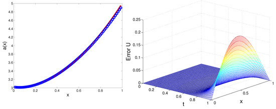 The measurements are located at grid nodes; namely, we take seven spatial nodes , at and all time layers. The initial data are regularized by smoothing the function using fifth-degree polynomial curve fitting. The stopping accuracy is . Actually, for all presented experiments at the first 2–3 iterations, the functional J decreases more rapidly and then, the decreasing is very small. On Figure 1 and Figure 2, we plot the true (exact) and restored diffusion coefficient and error of the computed by the inverse problem solution U for , and , , .