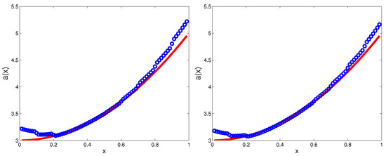 Exact (solid line) and restored (line with circles) diffusion coefficient , (left) and (right), , .
