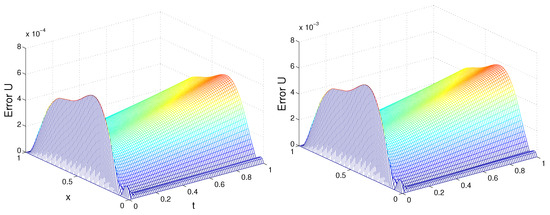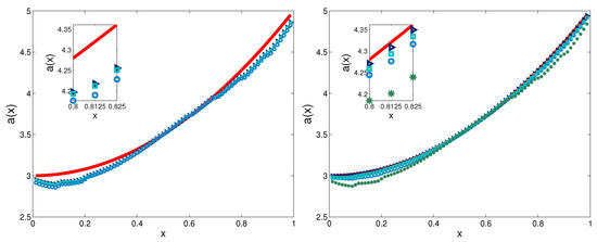 and generate perturbed data from (34), (35), replacing the exact solution u with a numerical solution of the direct problem, computed for the exact diffusion coefficient. Then, the solution of the discrete inverse problem U will be compared with the corresponding numerical solution of the direct problem. The computations are performed for and the same points of measurements as in previous test. On Figure 4 (left), we illustrate the impact of the fractional order on the accuracy for , . As before, we deduce that it is not so significant. On Figure 4 (right), we examine the impact of the perturbation on the accuracy for . We observe that the deviation has a larger impact on accuracy than the fractional order. On Figure 5, we plot the error of the solution for and two sets of perturbation and . In spite of the noise affecting the accuracy of the solution, it is evident that the precision of the solution is quite satisfactory when employing the recovered diffusion coefficient.