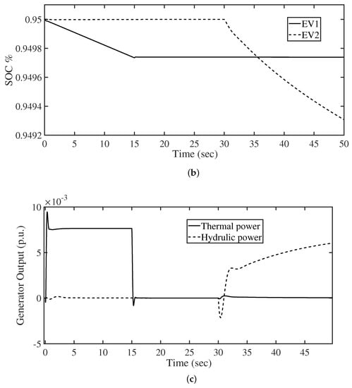 where and are the governor and turbine outputs of the thermal unit in area a, respectively. Whereas , , and are the governor, droop compensation, and penstock turbines outputs of the hydraulic generation in area b, respectively. In (4), vector u includes frequency regulation signals of each electrical power grid , and in addition to the participated power by EVs ( and ) as follows:
