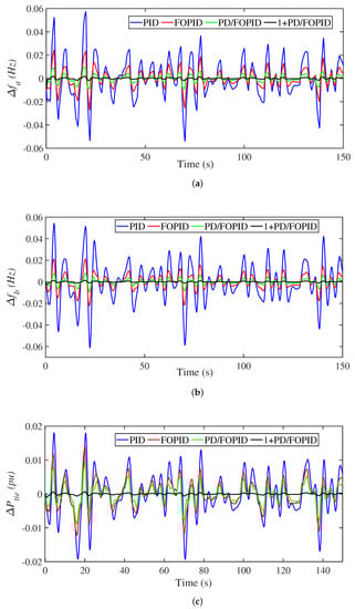 - The proposed frequency regulation control methodology is formed using a cascaded 2DoF 1 + PD/FOPID control method, which utilizes two input signals (namely the frequency deviation in each area, and control error in each area (ACE)). The utilization of two different signals is beneficial for the mitigation process of low- and high-frequency existing disturbances.