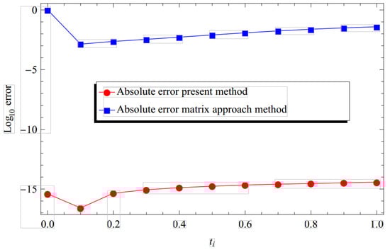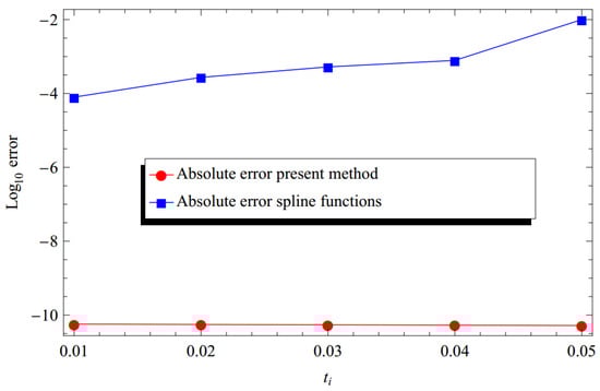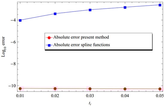 Absolute error comparison for Example 3 using the proposed Bernoulli wavelet (with ) and spline functions method of integral form (using h = 0.01 and m = 2) []. The CPU time used is 0.718 s at .