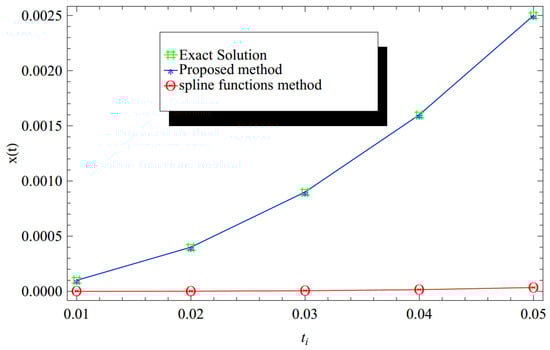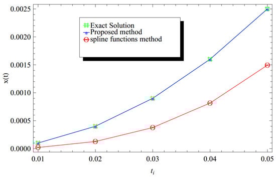 Numerical results comparison for Example 3 using the proposed Bernoulli wavelet (with ) and the spline functions method of integral form (using h = 0.01 and m = 2) []. The CPU time used is 0.765 s at .