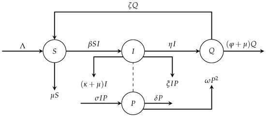 In recent past years, the study of the dynamics of the predator–prey system under parasite infection has been completed by simplifying it into two cases, i.e., intraspecific and interspecific transmissions. Intraspecific transmission refers to the condition when the disease cannot cross over the species barrier. The disease only spreads either in the prey [6,7,8,9,10,11] or in the predator population [12,13,14,15,16]. Intraspecific transmission emerges from the interaction between two or more individuals of the same species that may occur in their socio-sexual system through grooming, mating, or fighting behaviors to obtain access to limited resources. These behaviors influence the transmission of parasites from individual to group and population levels [17]. In other cases, there is a condition when one species is susceptible to disease, and other species can also be infected. In this case, both prey and predator populations become multiple hosts for disease transmission [18,19,20]. After all, the main objective of this existing research is to examine how disease transmission affects conspecifics or other species when two or more species are associated. In addition, some of the research also studies the effect of the other factors of ecology in eco-epidemiology systems, such as prey refuge [21,22], harvesting [23,24], treatment of infected species [25,26], and the Allee effect [27,28,29]. Moreover, disease transmission can be reduced by separating infected individuals from their healthy groups through quarantine procedures. Quarantine refers to the temporary separation of animals before they are brought into a group or territory to stop the spread of contagious diseases among healthy populations. Some epidemic models, such as in [30,31,32], show how quarantine might reduce the incidence rate of the disease in the environment. Therefore, it is important to research how quarantine affects predator–prey interactions with the presence of disease in the prey. As far as we know, there is no focus investigation on the eco-epidemic model that we have previously described.