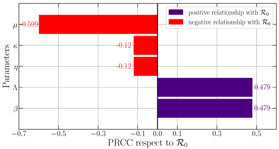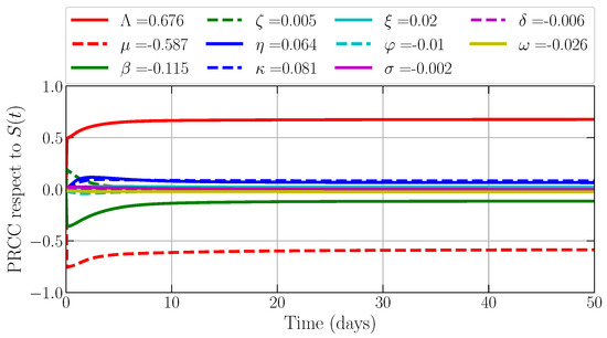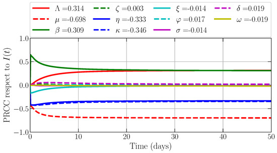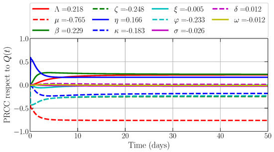 For investigating the most influential parameter regarding the density for each compartment, we also ignore the values of Λ, μ, δ, κ, and φ for the similar reason as above, where birth and death rate are fixed. We also simulate the PRCC for and take the PRCC value at by considering the convergence of all PRCC values. Now, we study the most influential parameter regarding the density of susceptible prey S(t). Figure 3 shows that the transmission rate becomes the first influential parameter with PRCC values provided by , which means that, if β increases, then the density of S decreases. The second place is provided by the quarantine rate with the PRCC value provided by . For infected prey (I(t)), we find that η and β still become the most influential parameters with PRCC values and ; see Figure 4. Next, Figure 5 shows that the recovery rate and the intraspecific disease transmission rate on prey become the most influential parameters to the density of quarantine prey (Q(t)), where the PRCC values are provided by and . These also confirm that is directly and η is inversely proportional to the density of Q(t).