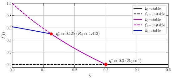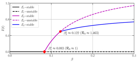 The solution of Equations (7), (9), and (10) will be studied in Section 3.3, Section 3.4 and Section 3.5. Especially for Equation (8), when , we have , and, hence, the solution not in , which states that the feasible equilibrium point does not exist for this condition. Moreover, to simplify the statement of the dynamical behavior, the locally and globally asymptotically stables are abbreviated by LAS and GAS. The LAS properties are obtained by applying linearization and obeying Matignon’s condition [52]. On the contrary, the GAS holds by constructing the Lyapunov function and investigating the sufficient condition; thus, the generalized LaSalle’s invariant principle provided by Huo et al. [53] is satisfied.