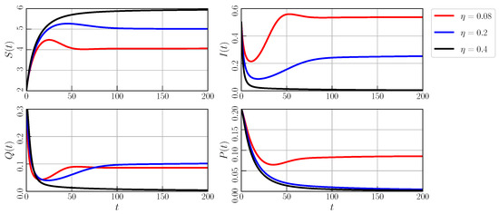 In this subsection, we explore more the dynamical behaviors of model (3) by providing some numerical simulations based on a predictor–corrector approach developed by Diethelm et al. [63]. Three important biological parameters are investigated, namely the intraspecific disease transmission rate on prey , quarantine rate on prey , and the memory effect . Since we do not study a specific ecological case, all parameter values are experimentally determined. All simulations are provided based on the following parameter values.