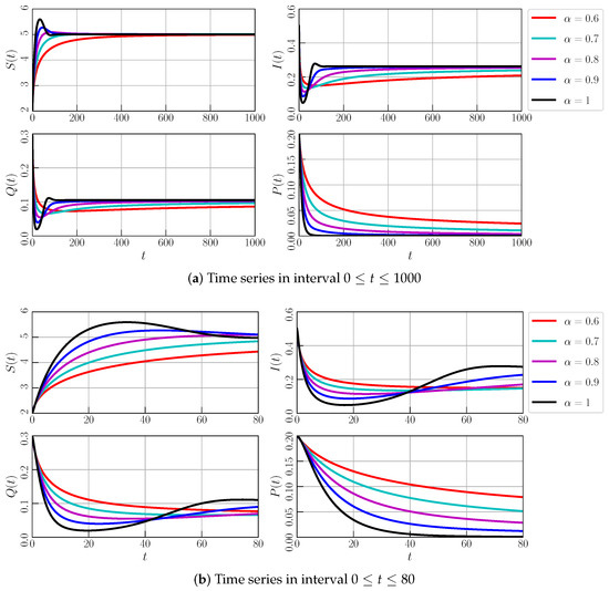 Finally, we investigate the impact of the memory effect on the dynamics of model (3). By using the parameter values from Equation (23), we vary the order of the derivative as the memory index. We set 0.6, 0.7, 0.8, 0.9, 1 and portray them in the time series provided by Figure 10. We confirm that, when is varied, all solutions seem to converge to the same equilibrium point. The difference lies in the convergence rate, where, for smaller , the convergence rate is also lower. This means that the memory affects the convergence rate of all compartments. These conditions are provided by Figure 10a. Furthermore, in Figure 10b, we find that has the highest peak for S(t), I(t), and Q(t) and lowest density for P(t). This means that the memory has an impact to the maximum density of all compartments.