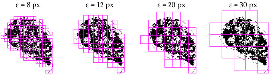 Fractal analysis was carried out on binary images using the FracLac plugin (A. Karperien, Charles Sturt University, Australia) for the ImageJ software [48]. The fractal dimension ( D b ) was calculated using the box counting method as well as the cumulative mass method, with agreement of the results for the same sets of grids. We applied a scaled series 7/8, meaning that an enlargement of a consequent grid cell size was about 1/8. By using a scaled series, a sufficient number of relatively dense data points for fitting the regression lines was easily obtained. Here, a total of 18 grid cell sizes were used to obtain data points for fitting the regression curves to describe the scale–count power law dependence. Specifically, grid cells sized ε ∈ {5, 6, 7, 8, 9, 10, 12, 14, 16, 18, 20, 23, 27, 30, 35, 40, 46, 52} px were used in both the box counting method and the cumulative mass method. Figure 1 shows an example binary image of a nucleus and also illustrates the typical nucleus size and the look of the chromatin texture, covered by grid cells of different sizes, ε. Typical grid cell arrangements are shown for four out of the eighteen utilized sizes, as denoted above each of the four plots. Twelve random grid origin positions per nucleus, per each grid cell size, were used.
