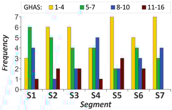 S2-S7, S3-S7, S4-S7, S5-S7 (p < 0.022)S2-S1, S3-S1, S4-S1, S6-S1 (p < 0.0001), S2-S7, S3-S7, S6-S7 (p < 0.011) S2-S4 (p < 0.025)S2-S1, S2-S4, S2-S6 (p < 0.040)