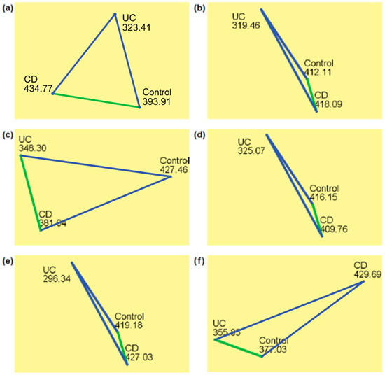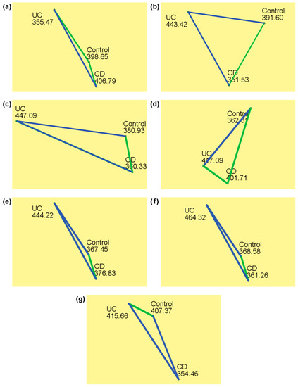 We estimated the FD of the epithelial cell nuclei to assess potential differences in the chromatin organizational complexity between the two major IBD subtypes in the pediatric age. The same analysis was performed to assess differences in the intestinal cell chromatin complexity between either of the IBD phenotypes and the control subjects. A comparison was performed on seven different intestinal segments (terminal ileum, cecum, ascending, transversal, descending and sigmoid colon and rectum). The differences in the FDs of the investigated nuclei are shown in Figure 4 and Table 4. Figure 4 shows the mean ranks according to the nonparametric Kruskal–Wallis H test, where the mean rank is the arithmetic average of the positions in the sorted FD list for a total of 780 analyzed epithelial cell nuclei. The blue lines show the statistically significant mean rank differences. The children with UC had a significantly higher FD of the cell nuclei chromatin texture than the controls in all colonic segments except for the rectum (p ≤ 0.035). Similar differences were revealed between the UC and CD children. Specifically, the UC patients had significantly higher FDs in comparison with the CD patients in every colon part except for the transversal colon (p ≤ 0.010). On the other hand, the children with Crohn’s disease had FDs that were statistically different from those of the controls only in the ileocecal valve and rectum (p = 0.005, p = 0.014; respectively), with lower median FD values in the CD patients. Interestingly, the terminal ileum of the CD patients, which is one of the most frequent localizations affected by the disease, had a statistically different nuclear FD only when compared with that of the UC patients.