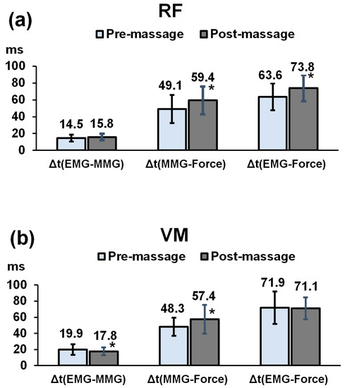 Effects of TFM on Δt(EMG–MMG), Δt(MMG–Force) and Δt(EMG–Force) in the RF (a) and VM (b). Values are expressed as the mean ± SD (n = 12). * indicates a significant difference between the pre- and post-massage groups at p < 0.05.