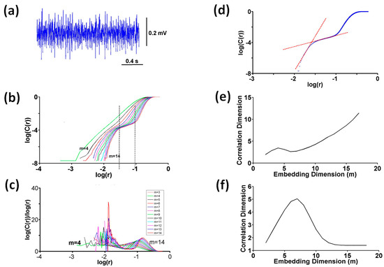 Furthermore, the correlation dimension is defined as the slope of the log(c(r)) vs. log(r) curve for small distances [36]. Takens’ theorem [39] assumes that the signal originates from the dynamics of the system and is noise-free. However, since the recorded EMG signal is noisy, the correlation integral curve (log(C(r)) vs. log(r)) calculated from the reconstructed state vectors is contaminated by the noise depending on the signal-to-noise ratio [40,42,65,66]. Noise will affect the correlation integral curve at small r values. Therefore, for a noisy physiological signal, it is crucial to determine the actual correlation dimension of the system. The correlation integral curves in the present study had three distinct regions. For r values smaller than −1.5, the slope of the correlation integral curve increased as m increased (Figure 2e). In fact, the slope approached m for high m values, which indicates that the state vectors filled the whole available state space, and the attractor had a high dimension. This region is called the “noise regime” [65,66]. According to the present study, since the dimension increased with the same magnitude as m, the noise contributing to the EMG signal might have been Gaussian noise [65].