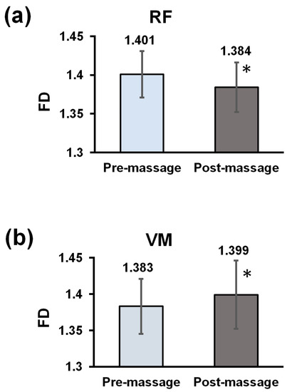 Effects of TFM on the FD of EMG signals for the RF (a) and VM (b). Values are expressed as the mean ± SD (n = 12). * indicates a significant difference between the pre- and post-massage groups at p < 0.05.