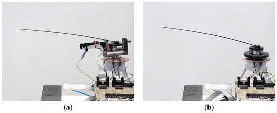 The experimental setup is a version of one degree of freedom (DOF) of the robotic system with a single flexible link shown in Figure 3a, which was used as a sensing antenna in haptic applications (refer to, e.g., [] for more details). It is a 2DOF platform, namely, it allows azimuth and elevation movement for the flexible link. From this system, 1DOF was removed (i.e., the elevation motor and its supporting structure) to allow only the link rotation on the horizontal plane. This modification aimed to avoid, as much as possible, the coupling of the resonant frequencies of the aforementioned motor structure set over the frequency response of the flexible link and, consequently, reduce noise in the experiments. Hence, the experimental platform used for this work is represented in Figure 3b, where it can be seen that a simpler component is used to attach the link to the azimuth motor.