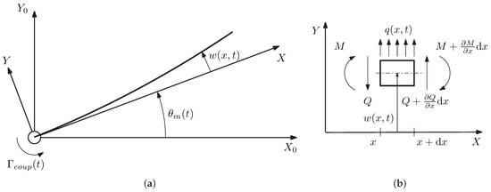 Therefore, we develop the dynamic model of a slewing flexible beam with fractional-order damping. Figure 4a details the scheme of the uniform flexible beam mentioned in the previous section. The following frames of reference are defined: an inertial frame and a non-inertial frame , which rotates attached to the motor. The rotation angle of with respect to is called the angle of the motor , is the transversal flexible deflection of the beam with respect to the frame , and is the coupling torque between the beam and the motor.