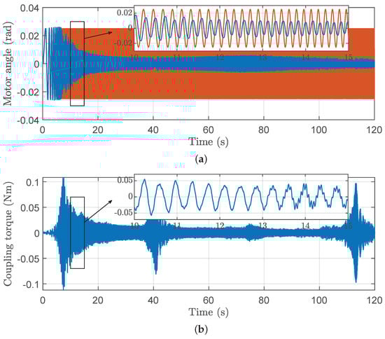 Finally, taking Equation (16) with from the solution of , the exact transfer function between the coupling torque and the motor angle can be obtained as:
