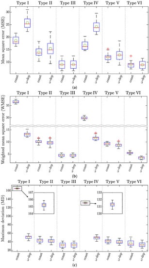 - With respect to WMSE (Figure 7b), lower values for each model are obtained with frequency-dependent weights, as is expected (the definition of WMSE takes the form of the cost function (26) for frequency-dependent weights). Additionally, similar to the results obtained with MSE, the models with the worst performance are type I and type IV, whereas models type III and type VI have the best results, with mean values of and for constant weights, and and for frequency-dependent weights, respectively. In contrast with MSE, it is appreciated that frequency-dependent weights provide a better result than constant ones for models type I, IV, and VI. This fact agrees with the results shown in Figure 6f.