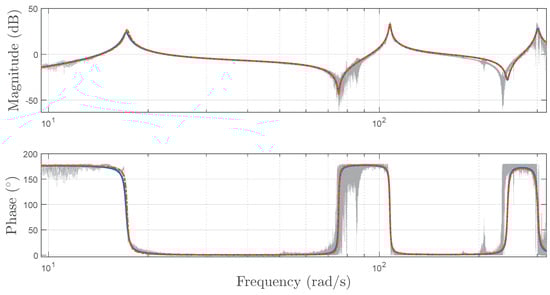 In summary, although model type III has a better variability in its parameters, model type VI obtained with frequency-dependent weights is the one that best fits the experimental responses. Since damping for the antenna moving in the air has little influence on the time response, the interest in this study is to improve the accuracy of identification of its frequencies. The real frequencies of the system will depend on the physical characteristics (namely, link material and geometry) of the antenna and its damping. Therefore, the best model is a model with integer-order internal and fractional-order external dampings. As already mentioned, this result indicates that, for our antenna, the internal damping is described by the classical Kelvin–Voigt damping, while the external damping suggests a more complex behavior between the beam and the environment, which is sometimes modeled as non-linear, as in []. For a clearer comparison of the two models identified as the best, Table 5 contains the parameters of the corresponding nominal models, as well as their fitting performance (data extracted from Table 3, Figure 7b, and Table 4, respectively); their frequency responses are plotted together in Figure 8 (curves are from Figure 6).