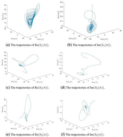 where . Additionally, the trajectories of the system (2) are provided in Figure 2 with the initial values , , when = 0.97.