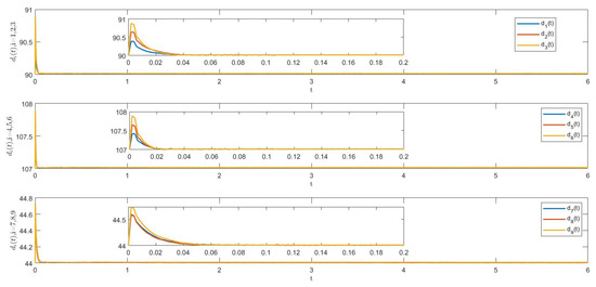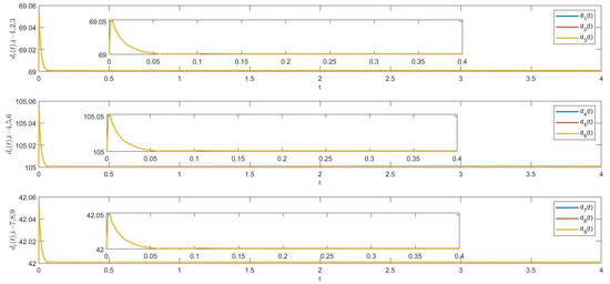 The trajectories of , , and () of system (1) via controllers (40) and (41) are shown in Figure 7. It is easy to see that the nodes from the same community have similar dynamic behaviors, whereas nodes from other communities display different dynamic behaviors. According to Figure 7 and Figure 8, system (1) can achieve FTCS via controllers (40) and (41), and the ST can be estimated as 5.6279.