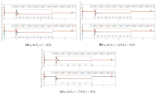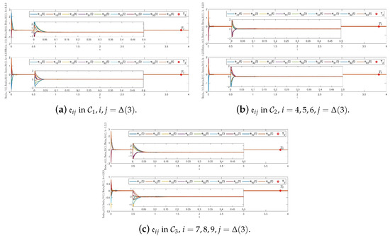 In FFCVDNs, there exists three communities. Figure 5 depicts the trajectories of state variables , , and () of system (1) via controllers (17) and (18). It is clear that nodes from the same community have similar dynamic behaviors, whereas nodes from other communities display different dynamic behaviors. This means that the system has achieved FTCS. The ST can be estimated as .