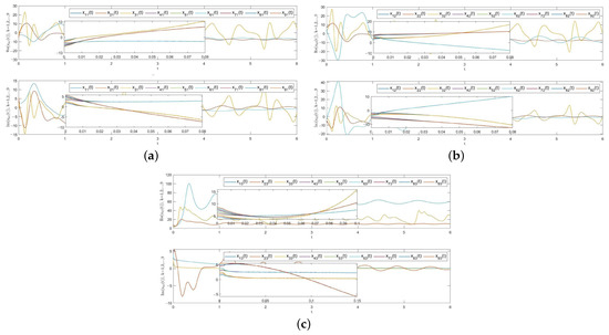 Trajectories of state variables of system (1) under controllers (40) and (41), . In each community, the trajectories of nodes can converge to the corresponding target trajectories. (a) Trajectories of under controllers (40) and (41), . (b) Trajectories of under the controllers (40) and (41), . (c) Trajectories of under controllers (40) and (41), .
