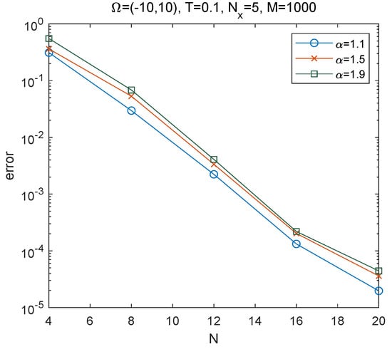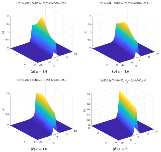 Due to there being no exact solution to problem (22) for , we approximate the error as error () We take and ; then, the numerical solutions to problem (22) with different are depicted in Figure 1. We observe that the shape of the solution will be affected by the order . When becomes smaller, the shape of the solution will change more quickly; when tends to 2, the numerical solutions are convergent to the solutions of the usual classical integer one. This property of the fractional Schrödinger equation can be used in physics to modify the shape of the wave without changing the nonlinearity and dispersion effects, readers can refer to [29] for more detail.
