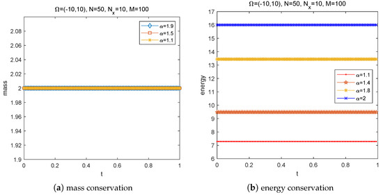 We also test the mass conservation and energy conservation. Figure 3 shows the evolution of mass and energy. We can see that the three curves of the left picture in Figure 3 overlap with each other, which further illustrates that the mass only depends on the initial values and is unaffected by different ; thus, we deduce that the numerical experiments coincide with Theorem 1.