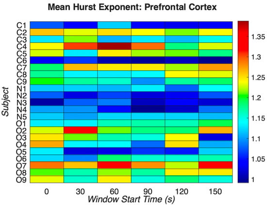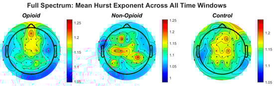 When comparing Hurst values for all EEG frequencies, values greater than the established threshold, T (i.e., 0.5), correspond to gamma band frequencies between 30–90 Hz in the ‘N’ and ‘O’ groups. Hurst values of the beta EEG frequency band predominate with Hurst values greater than those corresponding to the healthy control group, suggesting the impact of the Hurst effect globally to execute cyclic, regular, predictable, and persistent functions in the short and mid-term of the time series [1,11,13]. Figure 2 shows the mean Hurst exponent indices for prefrontal EEG electrodes across all groups using full spectrum EEG signals. In basal resting conditions, the H-values of the beta and gamma bands predominate the others. In the relative short medium term, H > 0.5 confers to the whole brain, the Hurst effect necessary to perform cyclic, regular, and persistent functions, accepting a certain degree of predictability. For other bands, lower Hurst values indicate anti-persistent processes in early windows and suggest persistent stability in later windows (Figure A1, Figure A2, Figure A3, Figure A4 and Figure A5). This accounts for resorting a central tendency value, suggesting fast information storage, and processing in response to opioid dependence [38,39].