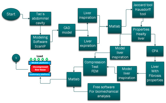 This work proposes a methodology to analyze liver tissue’s mechanical behavior under a compressive load by a finite element method and the analysis of the results using tools for image processing; this methodology is visualized in Figure 1 and Figure 2. Reconstructing a liver tissue computer-aided design/computer-aided engineering (CAD/CAE) model to accurately represent the mechanical behavior of natural liver tissue affected by fibrosis can be complex [23,24,25,26,27,28].