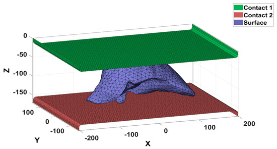 The first type of contact was related to the flat surfaces that exerted compression on the diaphragmatic area of the liver tissue. It was subdivided into Master Contact Surface 1 and Master Contact Surface 2. Master Contact Surface 1 moved 34 mm during the analysis, and Master Contact Surface 2 remained fixed during the analysis. The second type of contact was directly related to the three-dimensional liver tissue model because it was deformed and, therefore, was called the slave contact surface. The visualization of the contact surfaces is shown in Figure 5.