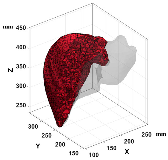 A tetrahedral mesh was used; this mesh provides satisfactory results for irregular surfaces such as liver tissue because this type of irregular surface is standard for a visceral surface. These surfaces are compressed by the organs surrounding this tissue due to natural processes in the human body. The STL liver tissue model had 1569 nodes before being re-meshed for tetrahedral mesh schemes. The three-dimensional model provided a surface geometry. The surface data were processed in a triangulated way. For both study cases, regular tetrahedral mesh was established, and the desired volume was specified to estimate the volume given by the input surface. The mesh was created with MATLAB® version R2019a (software application developed by MathWorks, Natick, MA, USA) with the characteristics of 19,493 nodes and 35,982 tetrahedrons. Figure 6 shows the tetrahedral mesh applied in the three-dimensional liver tissue model.