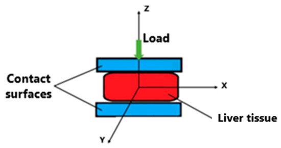 For this research, only the collagen concentration was considered for level F4 fibrosis. The properties were calculated approximately as the proportionality of the properties calculated for healthy liver tissue and the percentages of collagen between healthy conditions (F0) and with fibrosis (F4). The hyperelastic response of liver tissue was used to determine the elastic energy stored by a unit of volume, the stiffness present in the tissue, and the behavior of stresses and deformations. Collagen is one of the most common proteins in tissues because it is considered a structural element of soft tissues. In addition, collagen provides specific mechanical properties, such as stiffness, elasticity, and anisotropy. The Mooney–Rivlin model was used. Figure 7 shows the coordinate system used to make the proposed mathematical measurements.