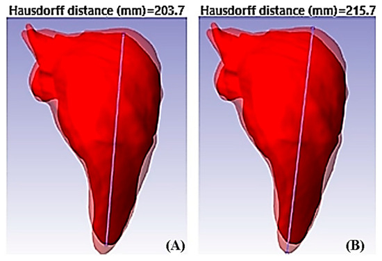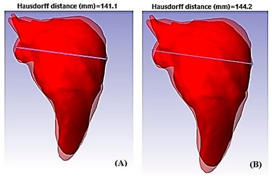 The third reduced invariant for both study cases presented a value of 1, which means that both liver tissues behaved like incompressible material. This means that their volumes were preserved during the deformation. Therefore, this required using a penalty method that avoided numerical instability. This method uses the volumetric modulus to make the calculations converge, and thus, avoids numerical instability. For the calculation of the vertical deformation, the heights in the initial and final states of the analysis carried out previously were considered. The heights are displayed in Figure 15, and the measurements of the heights were made using the Hausdorff distance code.