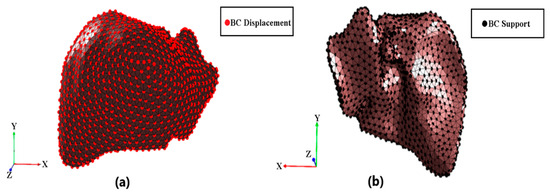 The nodes of the three-dimensional model were selected to define the conditions, classifying the nodes into two groups. The first group was related to the nodes of the visceral surface of the tissue, and these were the homogeneous boundary conditions (support nodes). The second group was related to the nodes of the diaphragmatic surface of the tissue. Therefore, they were the non-homogeneous boundary conditions (displacement nodes).