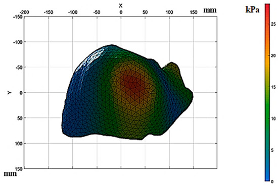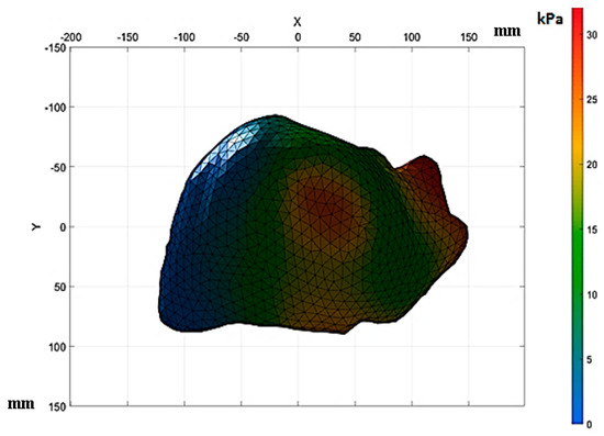 In Figure 12, the stress concentration is addressed in the anterior section of the upper sub-segment. The stresses were approximately 25 kPa and slightly in the upper lateral sub-segment. The stresses in this area were approximately 12 kPa based on the classification of Healey and Schroy [30]. The liver tissue segmentation without deformations and with deformations was performed and converted into binary images.
