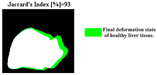 The view of the diaphragmatic surface corresponding to the X and Y axes provides a visualization of the most tissue surface. Taking the binary images, the code began by calculating the Jaccard similarity between the state without deformation and with deformation. In Figure 13, the results of the Jaccard similarity coefficient are displayed. Based on the results displayed, the healthy liver tissue under a compression load of 12,356 N had a similarity of 93%, which means that it underwent a deformation of 7% on the diaphragmatic surface.