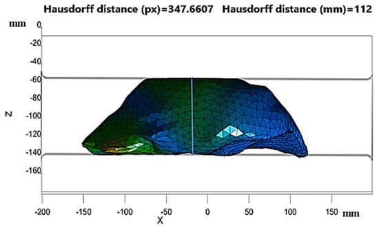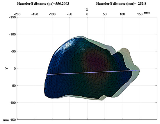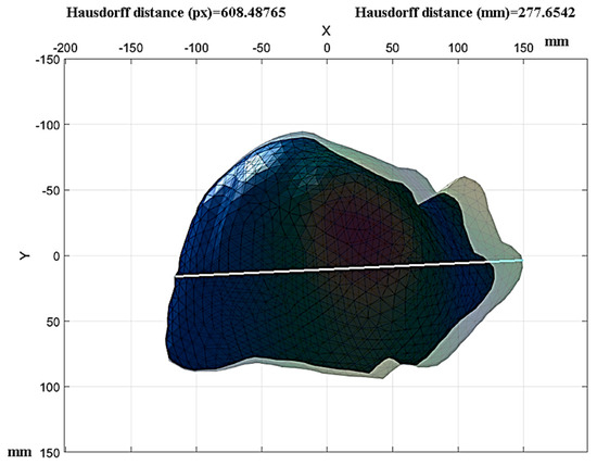 The Hausdorff distance was used to determine the displacements during the compression load. The image sequence of interest was the initial state of the analysis and the final state at the end, emphasizing that the images must be the same size to avoid errors in calculating the measurements. Based on the results displayed in Figure 14, a healthy liver tissue under a compression load of 12,356 N presented in its initial state with a length on the diaphragmatic surface of 242.8 mm, and in the final state, it presented a length of 277.65 mm.