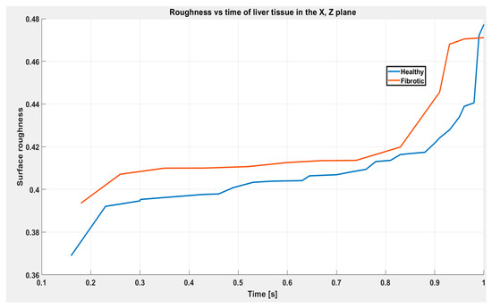 Figure 21 shows significant differences in the surface roughness between the healthy conditions and those affected by fibrosis. In the healthy liver tissue group, minimal surface roughness and close to ideal fractal structure were observed, indicating a smoother and more homogeneous surface. On the contrary, a notable increase in the surface roughness was observed in the group of liver tissue with fibrosis, showing more significant irregularity and fractal complexity. These outcomes highlight the utility of the Hausdorff fractal distance as a valuable tool in the characterization of roughness and the evaluation of surface changes in biological tissues subjected to mechanical loads. Furthermore, this difference in roughness could be significant for the mechanical analysis of tissue. With greater roughness, there are likely changes in the mechanical properties of the tissue, which could affect its behavior and response to external mechanical loads.