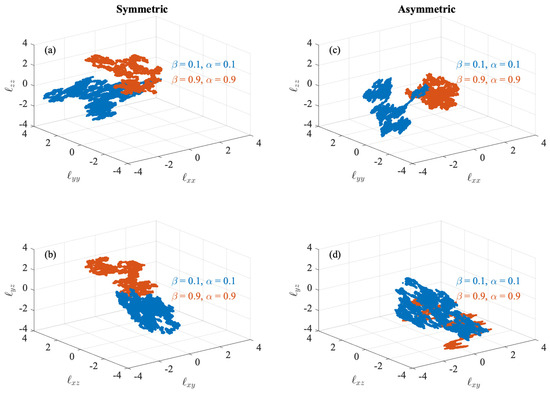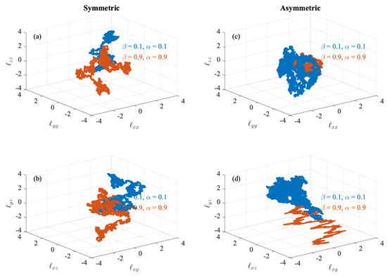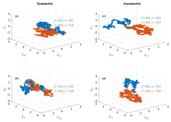 The phase-space dynamics of the diagonal (a) and off-diagonal (b) elements of the alfvénic dispersion tensor under the effect of symmetric field gradients . (c,d) The same for the asymmetric field gradients. Blue and orange points refer to laminar and turbulent plasma environments, respectively. Axes are reported in units of standard deviations for clarity.