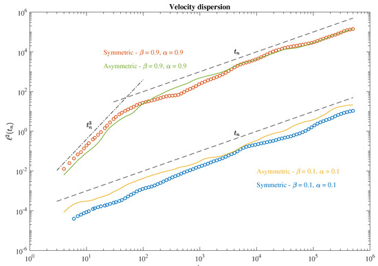 We cannot observe a distinctive phase-space dynamic between the different conditions, which seem to be all characterized by a Brownian-like coverage of the phase-space [39]. However, it seems that particles move along outward and inward trajectories that becomes very irregular for long times. Furthermore, there are also no distinctive features between the diagonal and off-diagonal separations, thus suggesting the existence of a chaotic nature [39]. We further inspect the statistics of the dispersion tensor by looking at the average square distances between elements as a function of the time steps under the different conditions. The results are reported in Figure 2.
