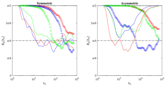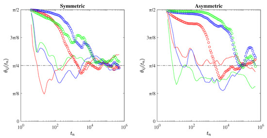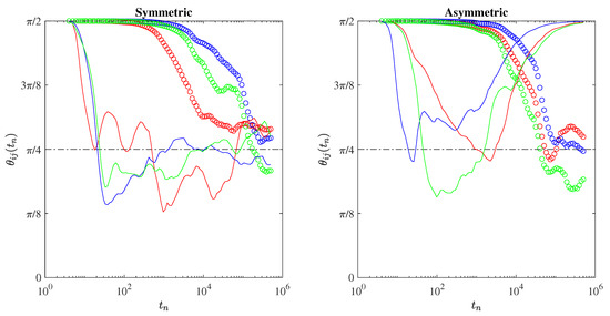 The anisotropy angles as a function of the time steps. Dots refer to laminar conditions, while lines refer to turbulent ones. Red, green, and blue lines/symbols refer to , , and , respectively. The dashed-dotted horizontal lines mark the purely isotropic advection condition .