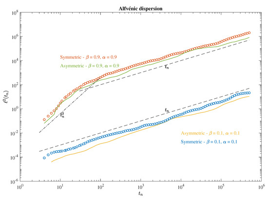 As for fluid velocity dispersion, there are no distinctive phase-space dynamics between the different conditions, which seem to all be characterized by a Brownian-like coverage of the phase-space [39]. However, more elongated structures are found for the symmetric case with respect to the asymmetric one, almost independent on the diagonal and off-diagonal separations. This seems to suggest that the magnetic field can play a role in ordering trajectories within a chaotic environment. We then inspect the statistics of the alfvénic dispersion tensor by looking at the average square distances between elements as a function of the time steps under the different conditions. The results are reported in Figure 5.