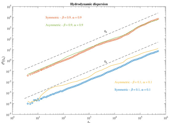 The average square distances between elements for the hydrodynamic dispersion as a function of the time steps. Dots refer to the symmetric field gradients, while lines refer to asymmetric field gradients. Orange and green correspond to turbulent conditions, while yellow and blue to laminar ones. The dashed lines refer to the Brownian scaling .