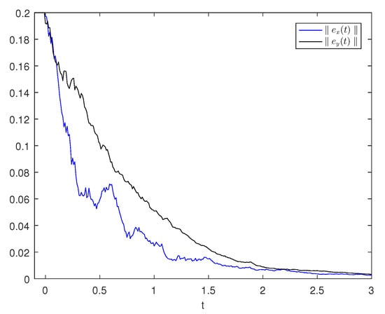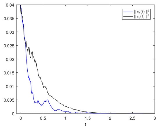 Let such that It is easy to calculate that , and The norms of the synchronization error and , as well as the state trajectories of their squared values, are illustrated in Figure 1 and Figure 2 for systems (1) and (2). The state trajectories of are depicted in Figure 3. Finally, based on Figure 4 and Theorem 2, we can deduce the finite-time synchronization time .